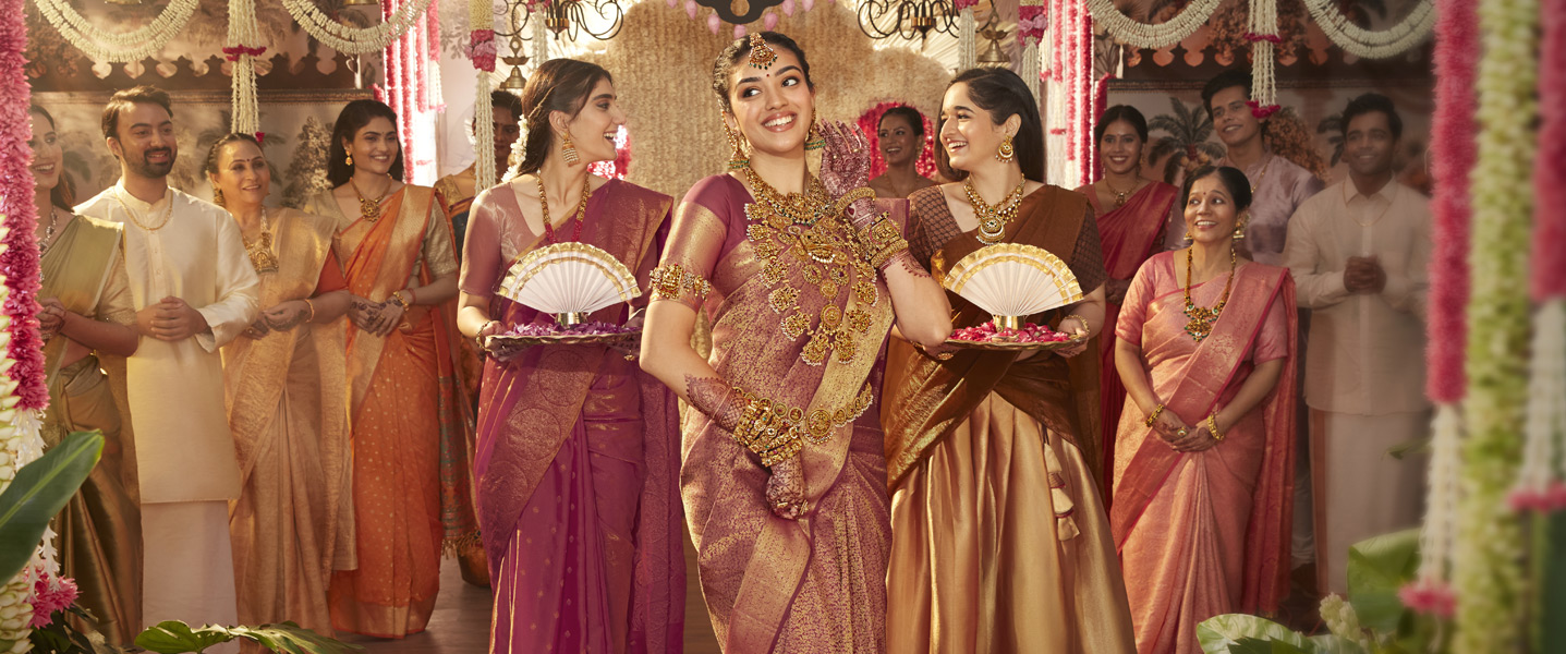 Amidst the beats of the chendamelam and the fragrance of jasmine, she walks in, radiant, divine, surrounded by friendship and love. The bride. The shining star of her wedding. It is her stunning beauty that has inspired our collections. Crafted to complement the celebration around her, and the joy that fills her heart.